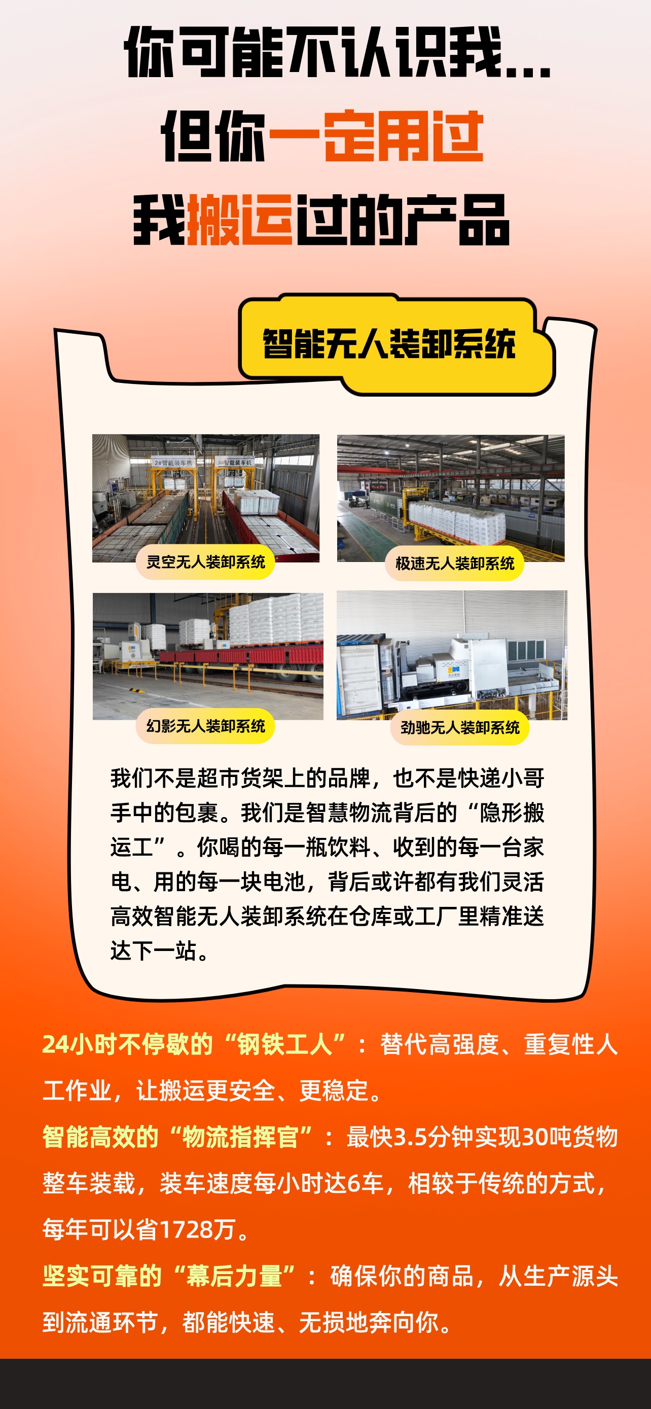 幻影/靈空/極速/勁馳四大產(chǎn)品線(xiàn):全面覆蓋國(guó)內(nèi)公路運(yùn)輸所有車(chē)型,包括后裝式集裝箱車(chē)、飛翼式集裝箱車(chē)、卷簾車(chē)、邊欄板可拆放及不可拆放平板車(chē)等終端物料發(fā)貨裝車(chē),裝車(chē)過(guò)程實(shí)現(xiàn)自動(dòng)化、智能化操作,20分鐘內(nèi)完成30噸貨物裝車(chē),產(chǎn)品填補(bǔ)國(guó)內(nèi)終端物料智能無(wú)人裝車(chē)空白,可完全替代國(guó)外進(jìn)口產(chǎn)品,獲評(píng)省內(nèi)首臺(tái)(套)重大技術(shù)裝備4項(xiàng)、省級(jí)重點(diǎn)新產(chǎn)品9項(xiàng)。